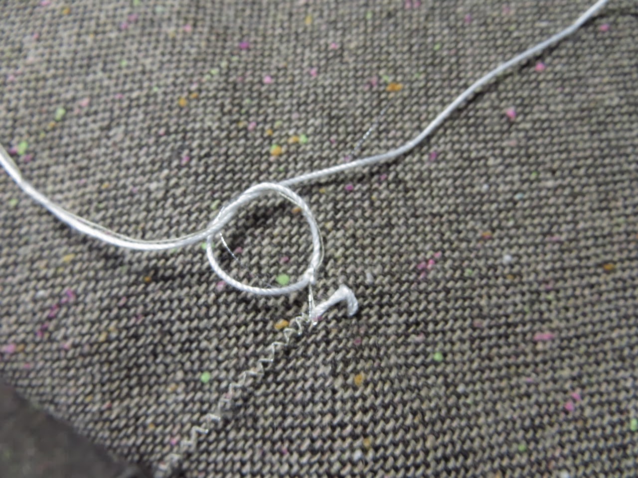 The first 2 stitches you will do are where you can see my pins in the photo above.  These stitches will hold your vertical strip flat instead of wanting to scrunch up to one side.