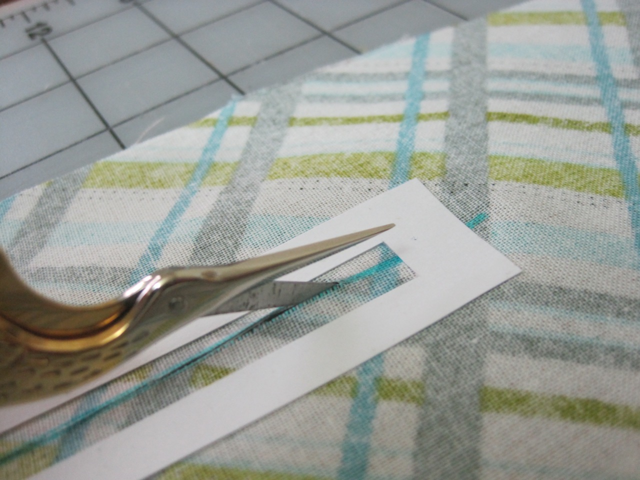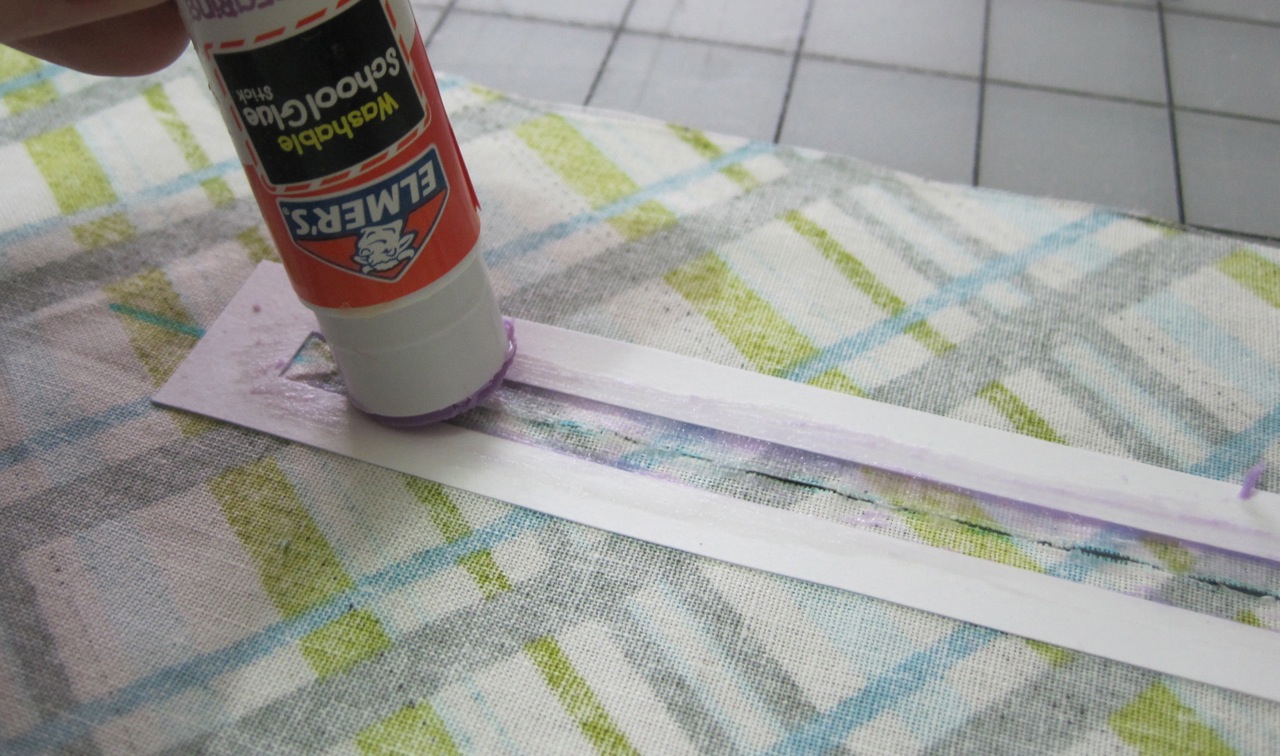 Rub glue over the fabric in the center of the window on your zipper stay (it’s okay to get it on the cardstock as well).