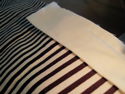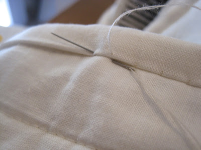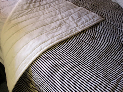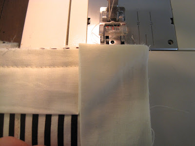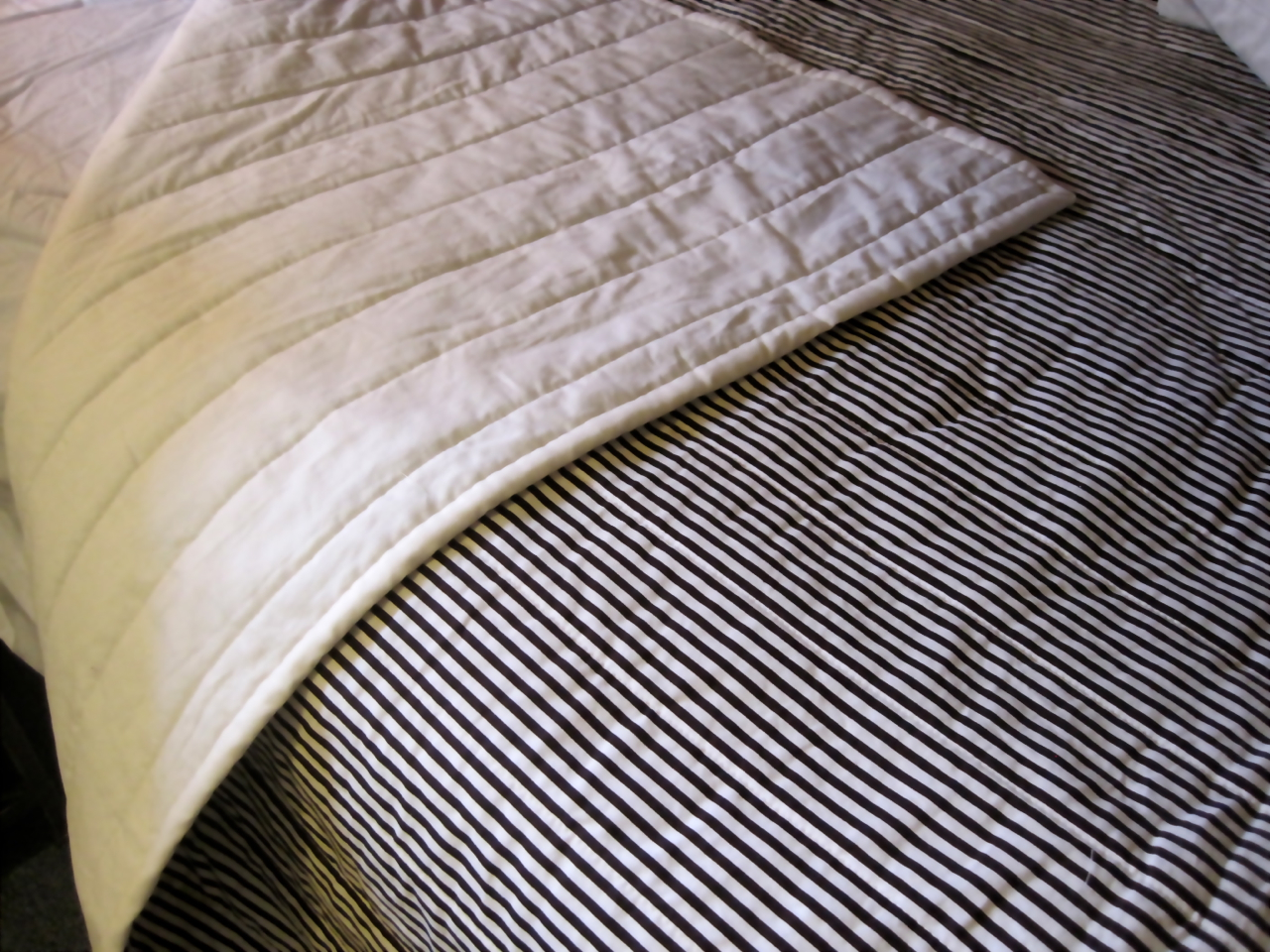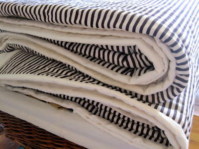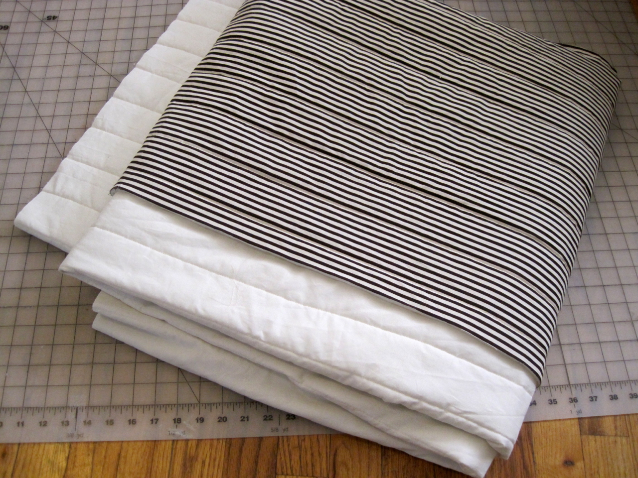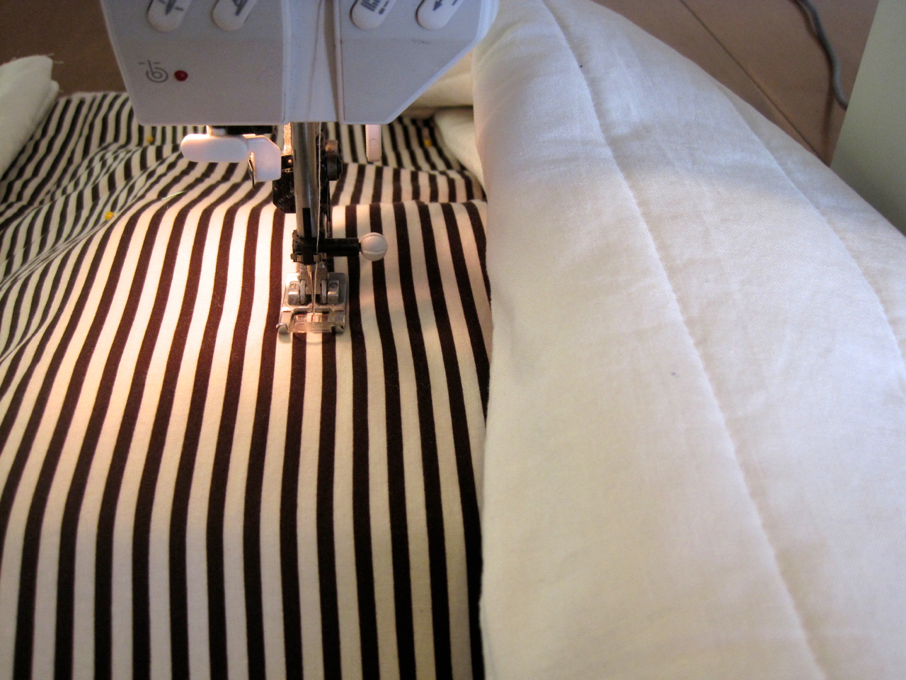 Once your layers are pinned together you can either hand or machine quilt. My fabric had stripes on the top side so I used the stripes to guide where I quilted. I think I quilted on every 7th white stripe. You can do free-motion quilting where you make a random pattern on the top with a darning foot and feed dogs on your machine down or you can mark with a fabric marker where you want to quilt. I like long straight lines because I don’t have to move my fabric around so much.