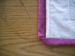 Now you’re ready to hand stitch your binding! This is one of my favorite parts! You’ll fold your binding over the raw edges and just enough to cover your stitches on the other side. It’s probably easier just to look at the picture and figure out how to do it, but I’ll explain how I do it just in case. I put a 2 pins in to hold my binding with about a 10-inch spacing just to hold the binding down while I’m working, then I’ll move them as needed. I like 2 strands of thread and start my end inside the seam allowance to hide the knot, then come up barely on the edge of the binding and put my needle just to the side of that hole on my quilt. I make a stitch about every 1/4″ along my binding. The corners might seam tricky but they’re not! I forgot to take pictures so I found some pictures online.