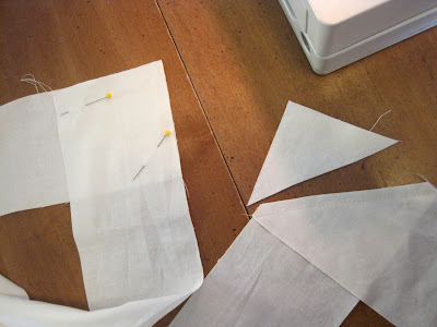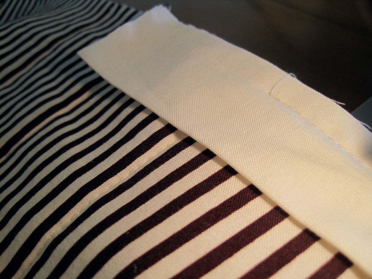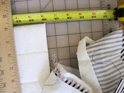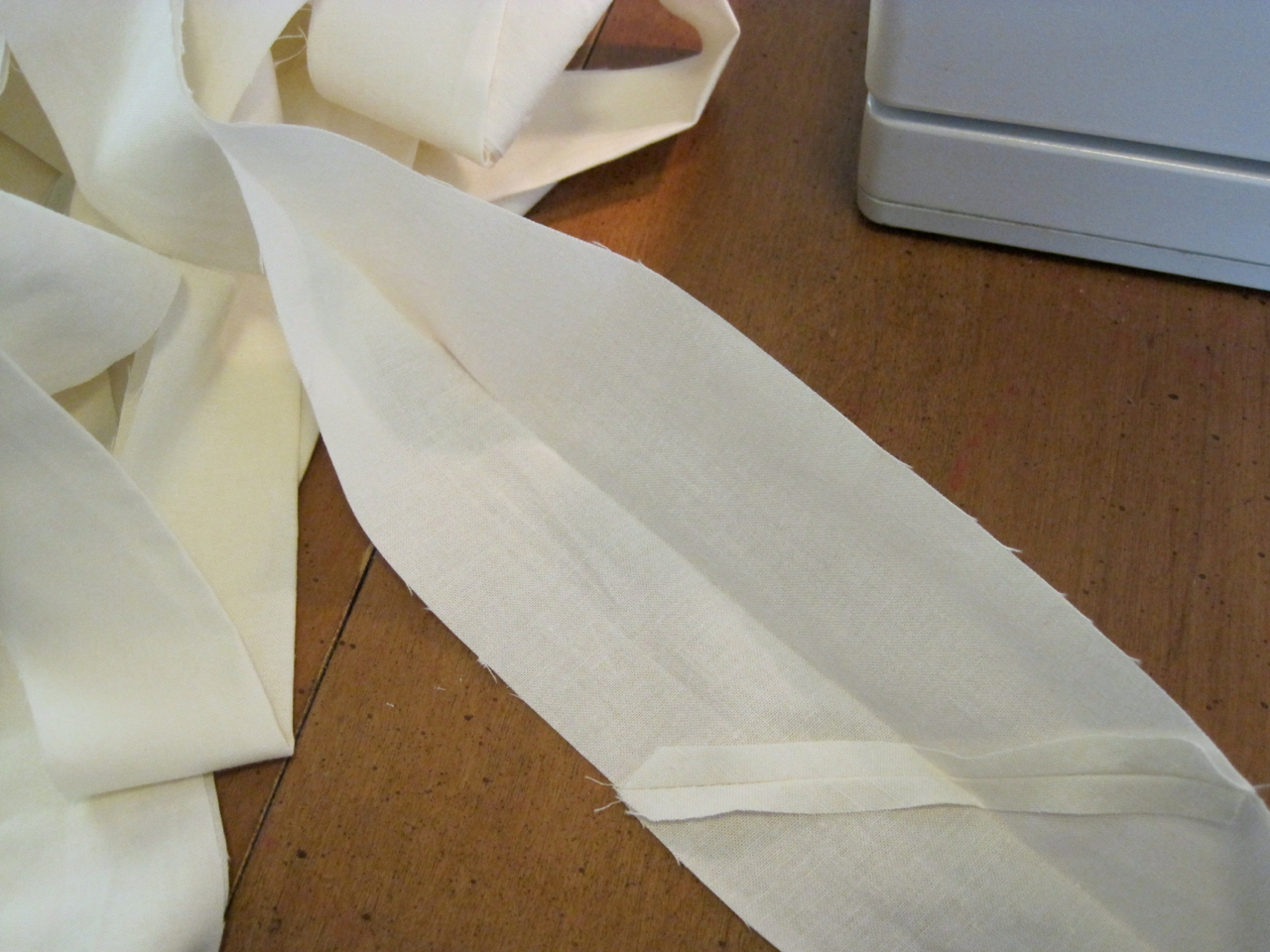 For binding: cut enough 3″-wide stripes of fabric to make about 9 yards in length. Piece your lengths together by matching up right-sides, pinning and sewing from corner to corner. Cut off extra.