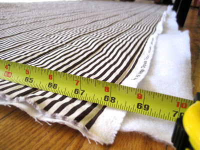 Project Time: Approximately 4 hours Finished Measurements: 68″-wide x 90″-long Material Shopping List: 5 1/4 yds (45″-wide) top fabric* 5 1/4 yds (45″-wide) bottom fabric* 2 3/4 yds (90″-wide) batting (I used 1/4″ batting so the quilts could be used year round) Thread *The width of fabric determines how many yards you will get. I was working with 45-inch wide fabric so I had to sew 2 pieces together to get it wide enough then I used the extra length on the sides cut stripes for my binding. Get enough fabric so you will have a top and bottom piece at least 72″-wide x 94″-long (giving you 2-3 inches extra on each side to work with) and also factor in that you will need about 9 yards x 3″-wide stripes for binding. The binding can be several stripe pieced together for the length. After you quilt your layers together you will cut it down to finished measurement size.