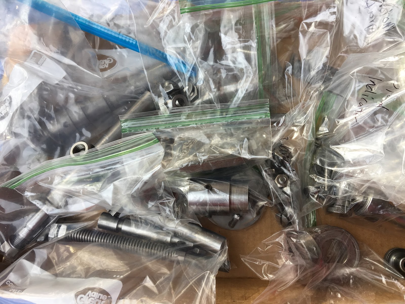 As I disassembled, all the parts got put into labeled bags and thrown into a bucket. For several days I worked on opening each bag and cleaning every single nut, bolt and washer on my fine wire wheel. Each piece got rubbed clean with WD40 and put into a clean bag.
