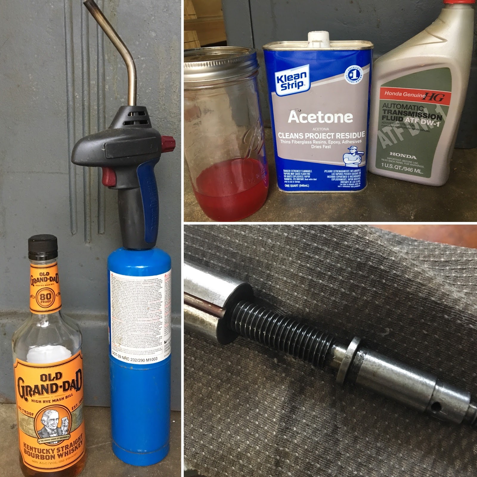 There’s an ‘old timer’ homemade penetrating oil recipe that people swear by. Apparently it requires less torque to separate frozen parts than any other product. So I mixed my acetone and automatic transmission fluid with a 50:50 ratio. I found a YouTuber who claimed a splash of whiskey to be even more effective (other chemists agreed in the comments – eh). I needed all the help I could get so I asked a neighbor if they had some whiskey I could have and they also let me borrow their blow-torch! 😂 Anyways, I’m not sure if it was the home-made brew+heat or if it was because I used more torque. Either way, there was a ‘pop’ and it was loose!