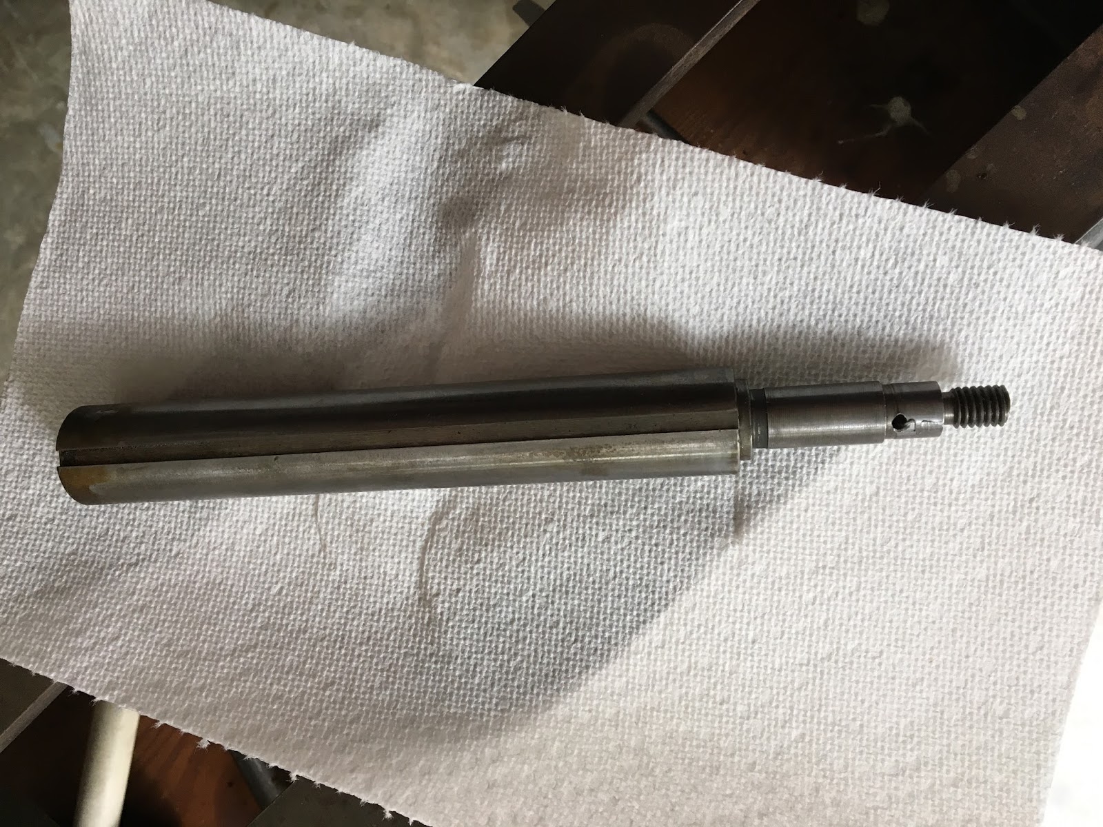 This is the quill from the tailstock.  This little bugger caused me the most stress out of the whole restoration.  It’s 2 pieces, a threaded end that threads/unthreads inside the quill which makes it advance in and out of the tailstock.  They were stuck together.  My attempts to bust them loose wasn’t working so I did some research.