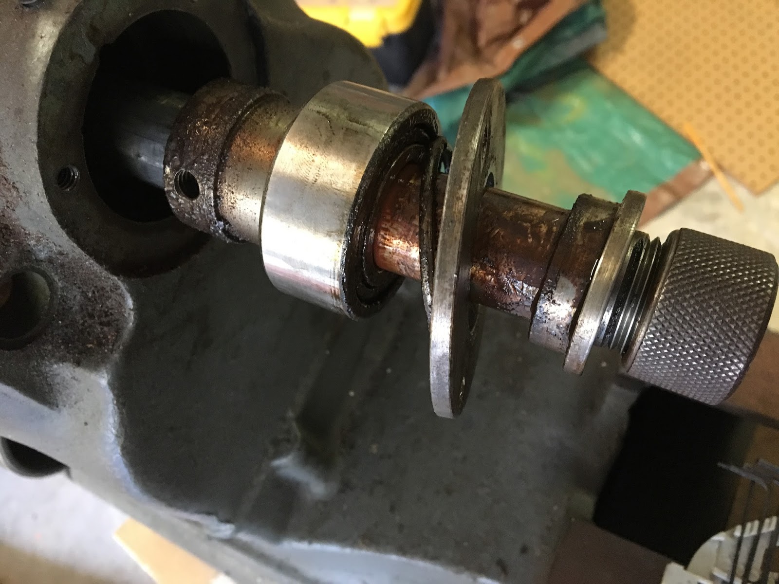 After removing all the parts it was obvious why the pulley was stuck! – look at the big mess the set screws made on the spindle!  I ground down all the burrs carefully with my bench grinder.
