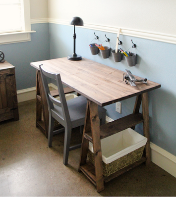 Here is a sawhorse-style desk I found on Ana White’s website. Our particle board desk was bowing in the center from the weight of the computer (that’s pathetic, right!?) so it was time to make a new one!