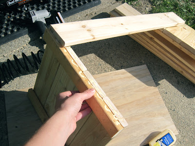 Step 3 – Align, glue* and nail your 27″ (1×4) board with the routed groove to the same end as the routed groove on your sides.  I put 3 brads in each board.