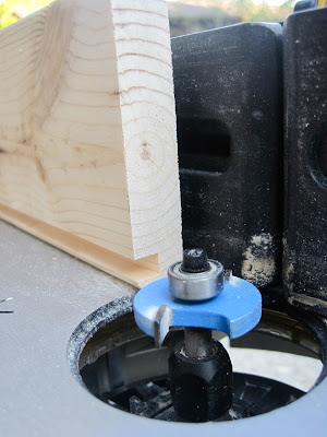 Step 1 – make a groove with your router and bit on the bottom edge of 2 of your 27″ (1×4) and 2 of your 13″ (1×4) boards.  You’ll want the groove at least 1/4″ above the bottom edge and 1/4″ deep.  This groove is for your panel board to slide into.