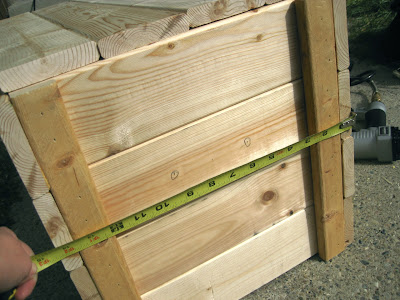 Step 6 – For the lid, lay out your 4 – 25.5″ (1×4) pieces and aline together. Glue* and nail your 12″ (1×2) pieces to these boards so they are 4″ from the ends.